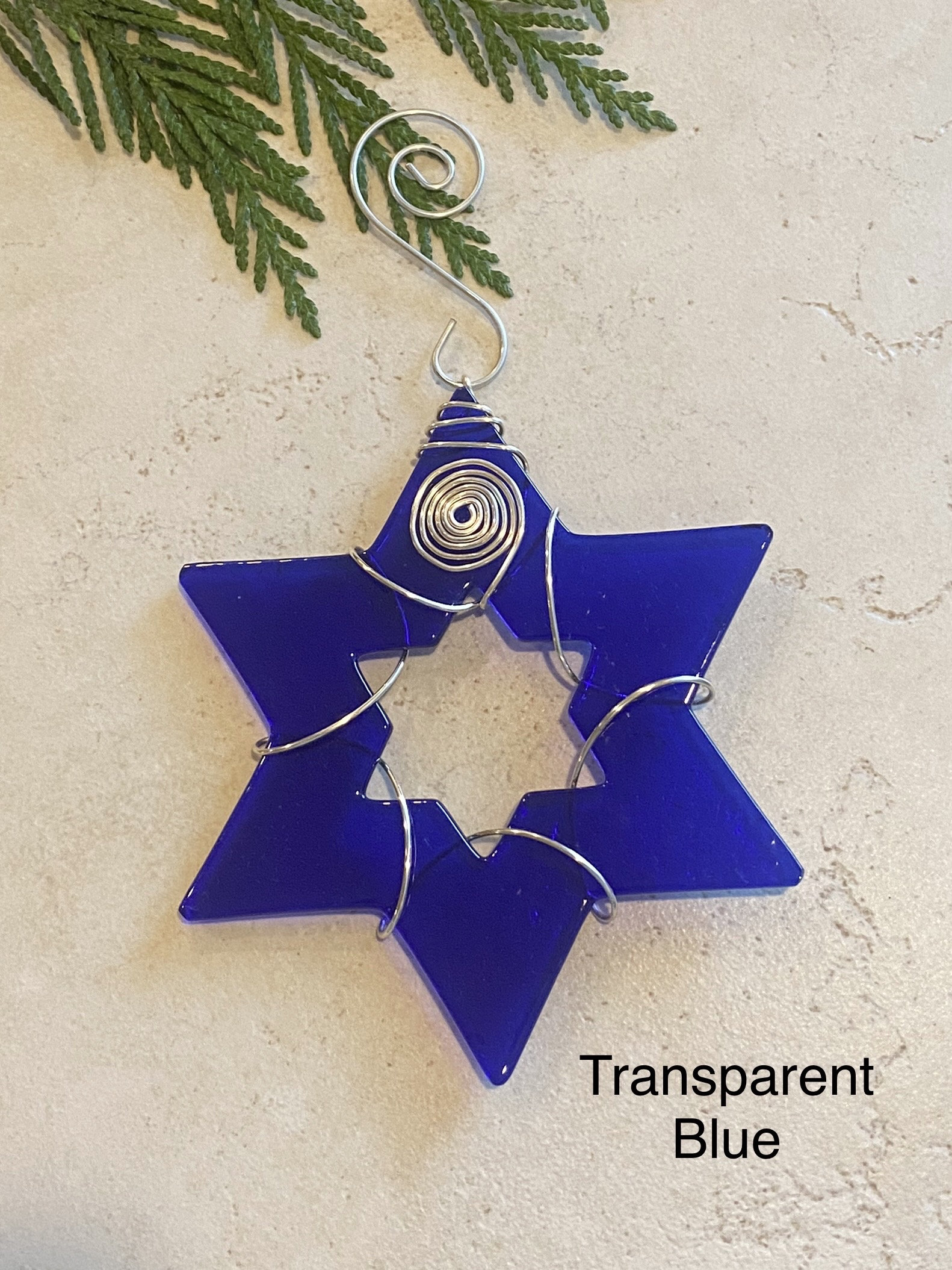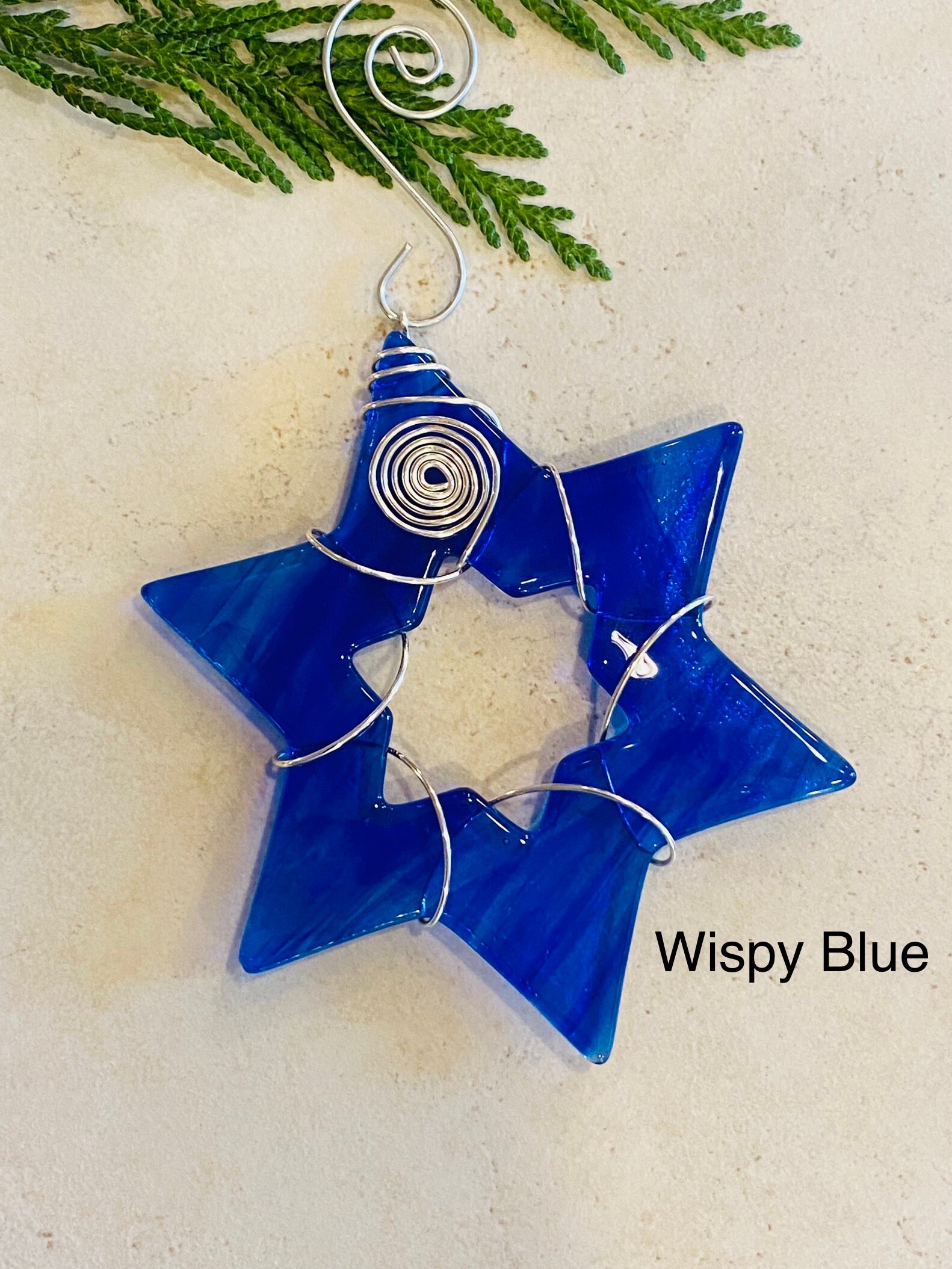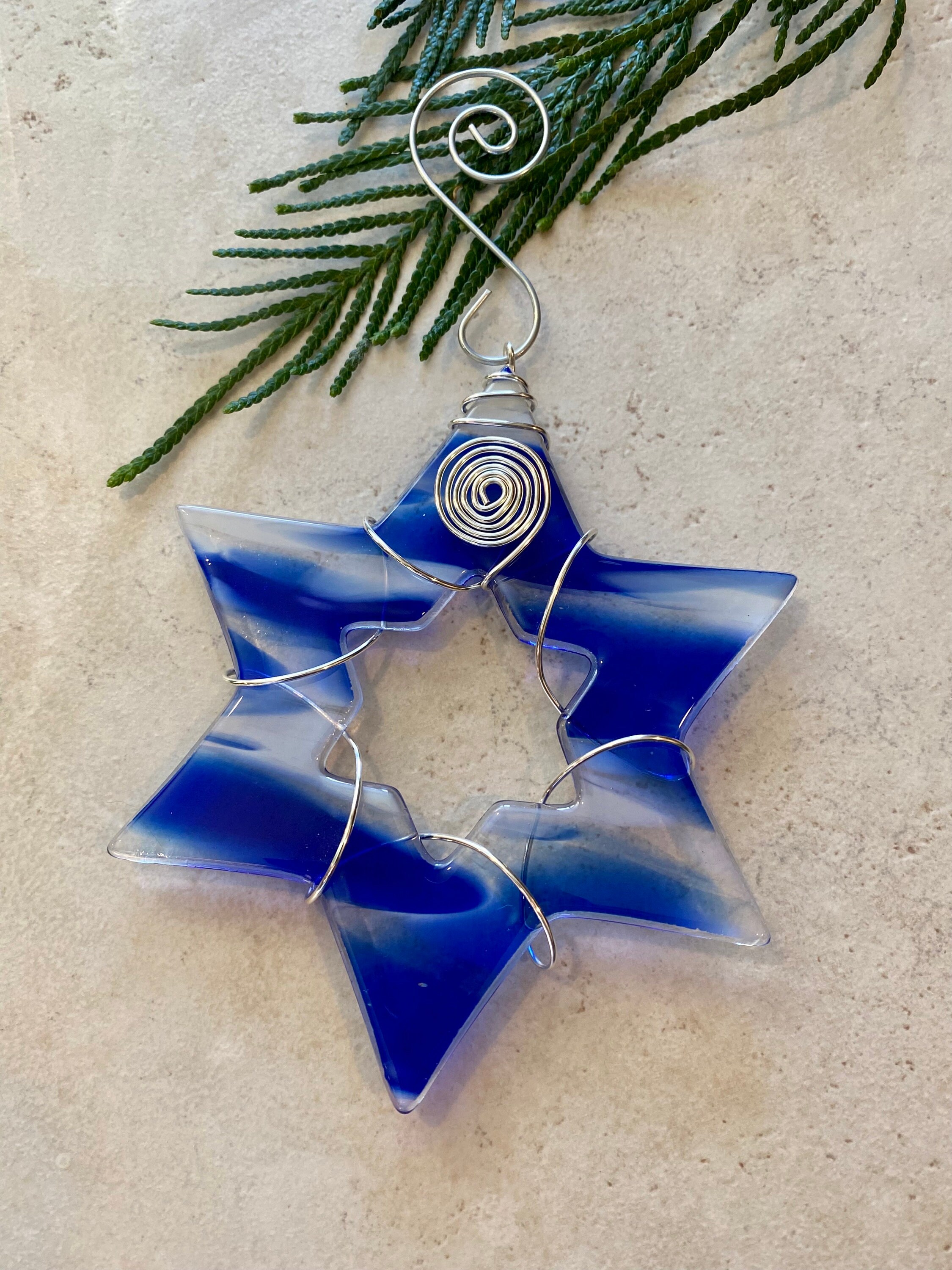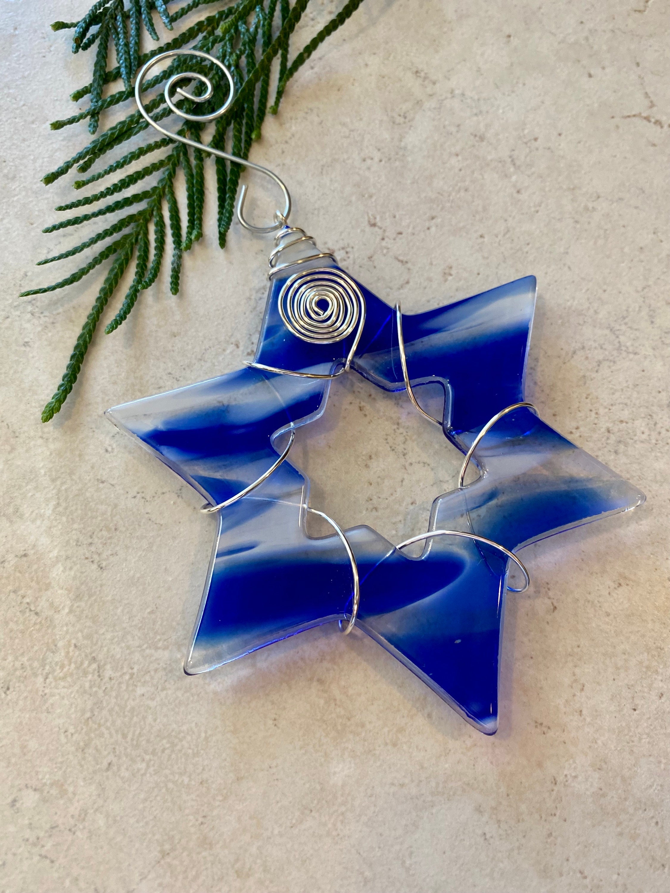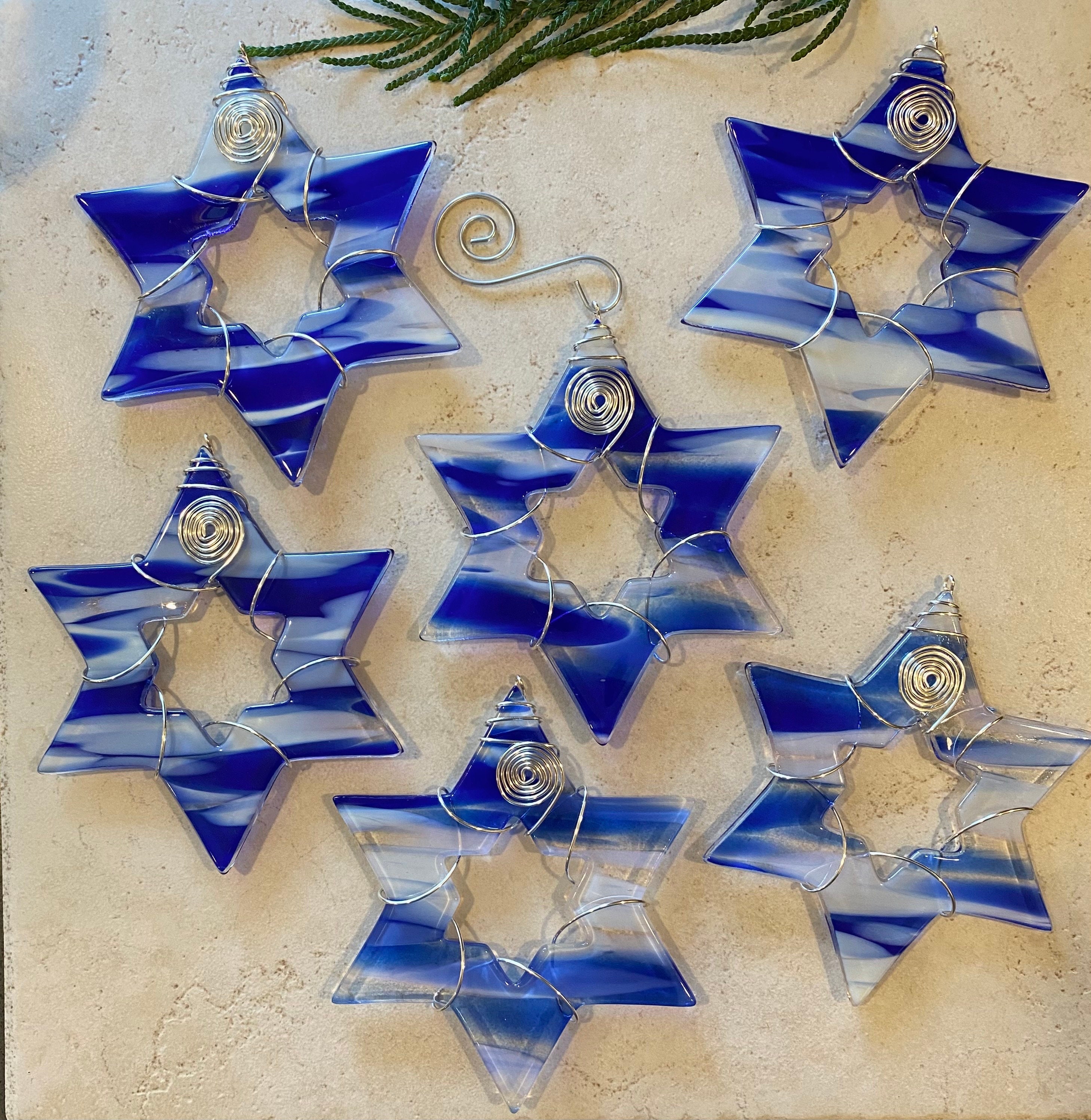 The star is made with decorative glass that has flowing streaks of cobalt blue and white. Each star has been cut, fused in a glass kiln, and then is carefully wire wrapped for hanging. The wrapped star is approximately 4.50 inches tall from top to bottom (tip to tip), and a silver hook to hang it is also included with purchase. This one-of-a-kind Star of David makes a great gift, or would be a treasured addition to your own collection. A wonderful additional to your Hanukkah or Chanukah decorations.